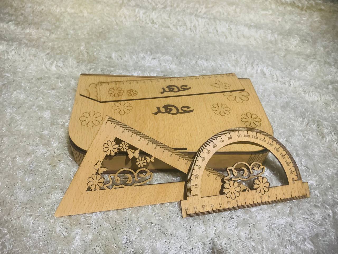 ✨ بوكس المدرسة (مقلمة خشب + أدوات هندسية بالاسم حفر)